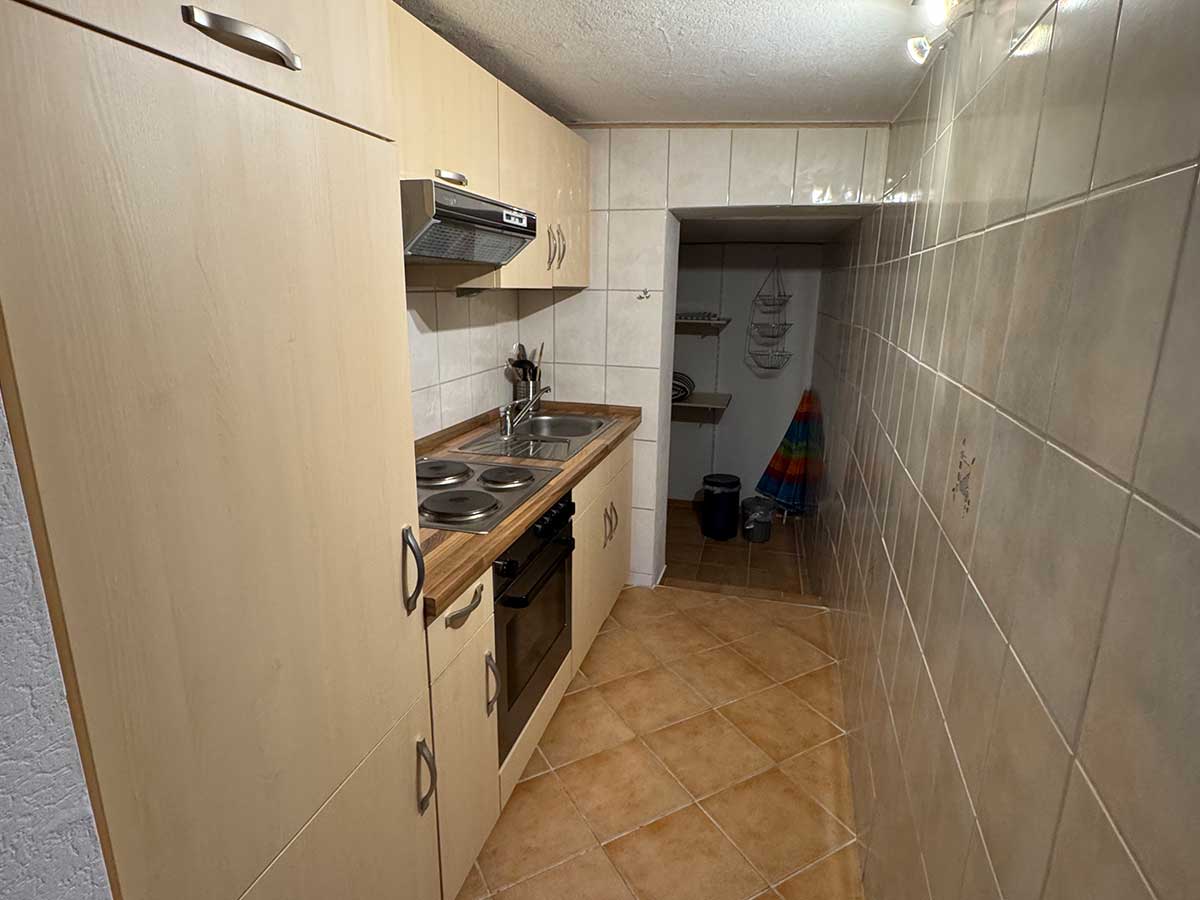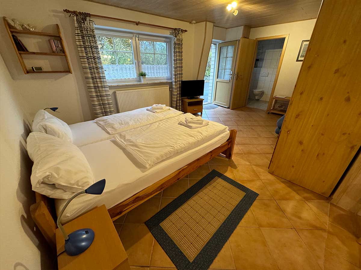 Ein-Raum-Appartement, Schlafbereich mit Doppelbett, Pantry-Küche mit Essbereich, Bad mit Dusche und WC, Aufbettung durch Schlafcouch möglich, Außenbereich mit Gartenmöbeln, ca. 26 qm, Parterre