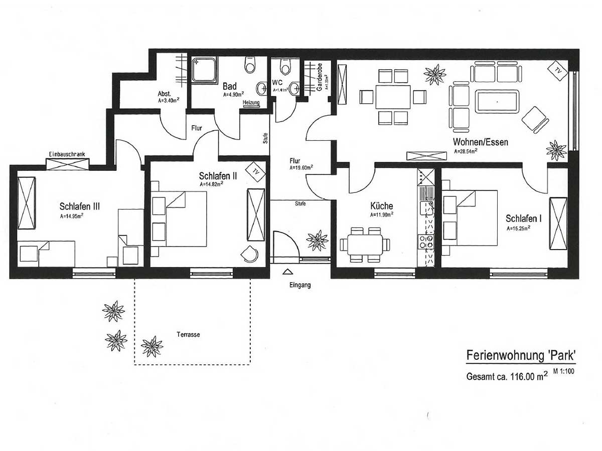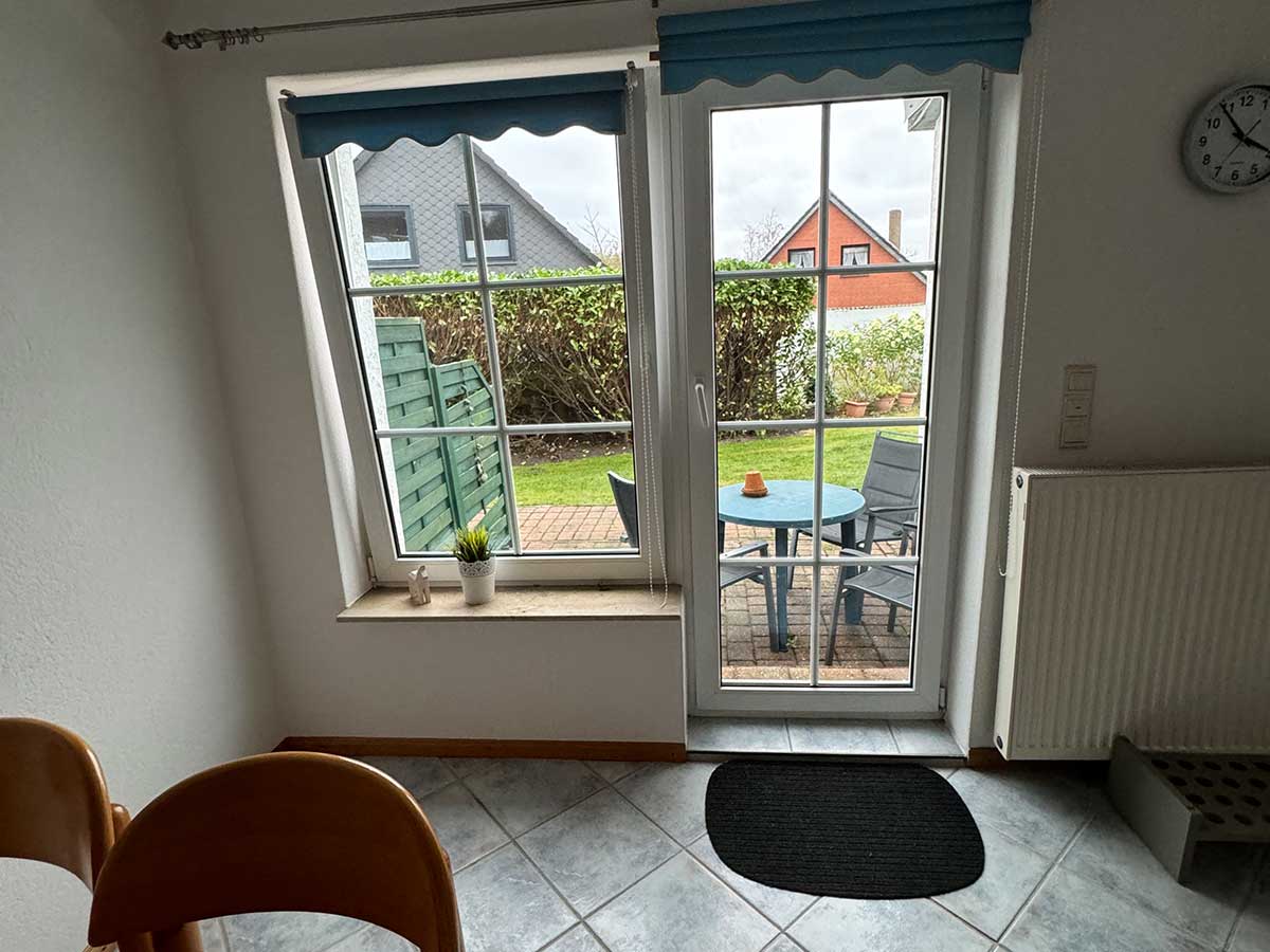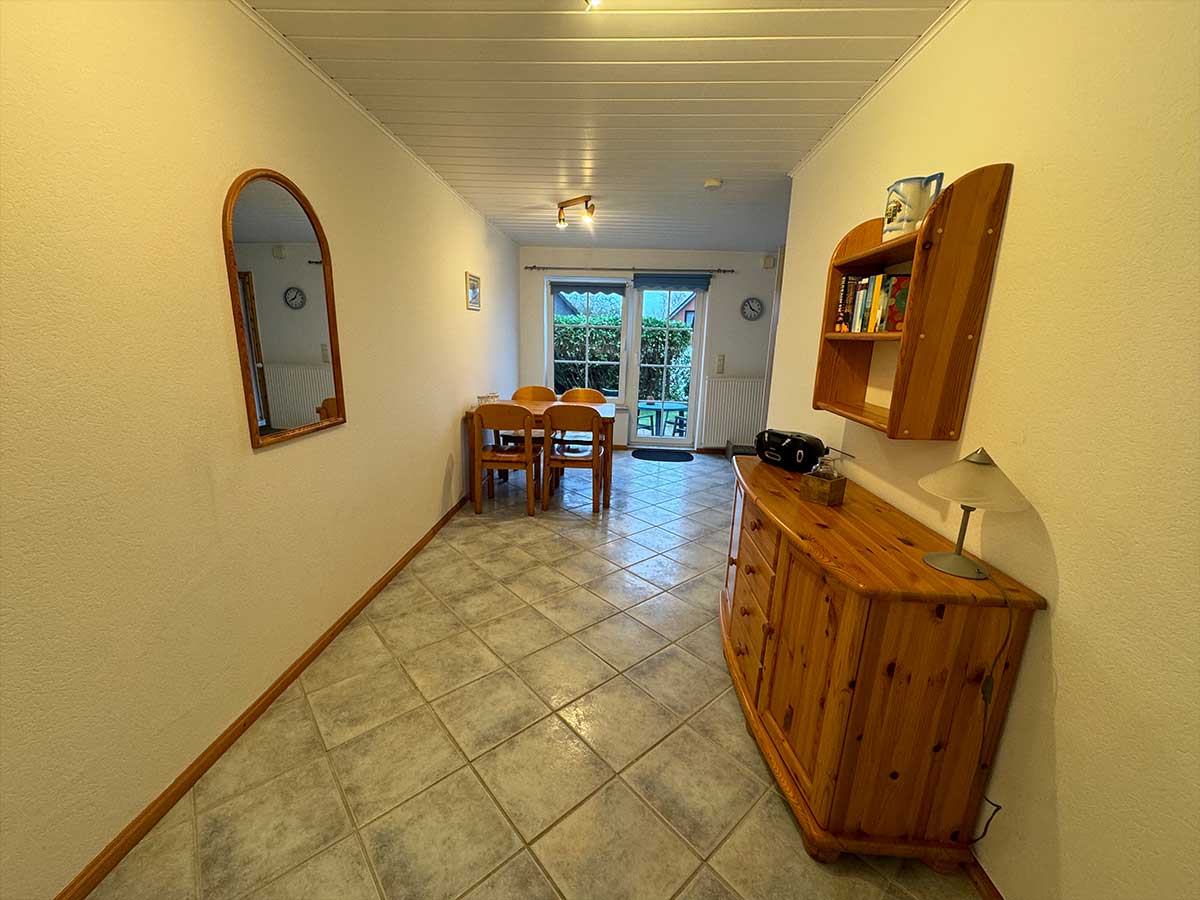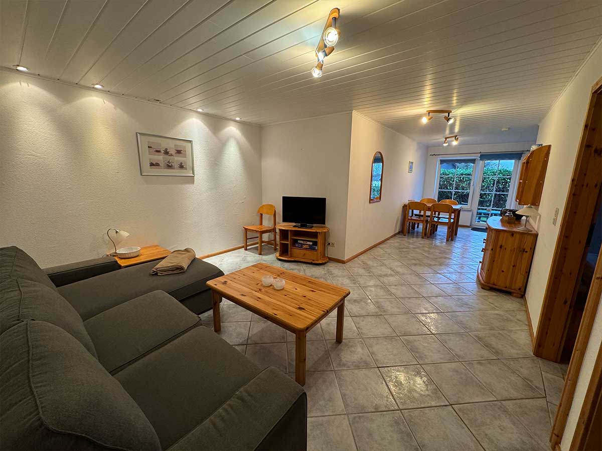 (Parterre) Flur, Wohnzimmer mit Couch, Essecke und offener Küche, Bad mit Dusche und WC, ein Schlafzimmer mit Doppelbett, ein Schlafzimmer mit zwei Einzelbetten, Terrasse mit Gartenmöbeln und Grill.